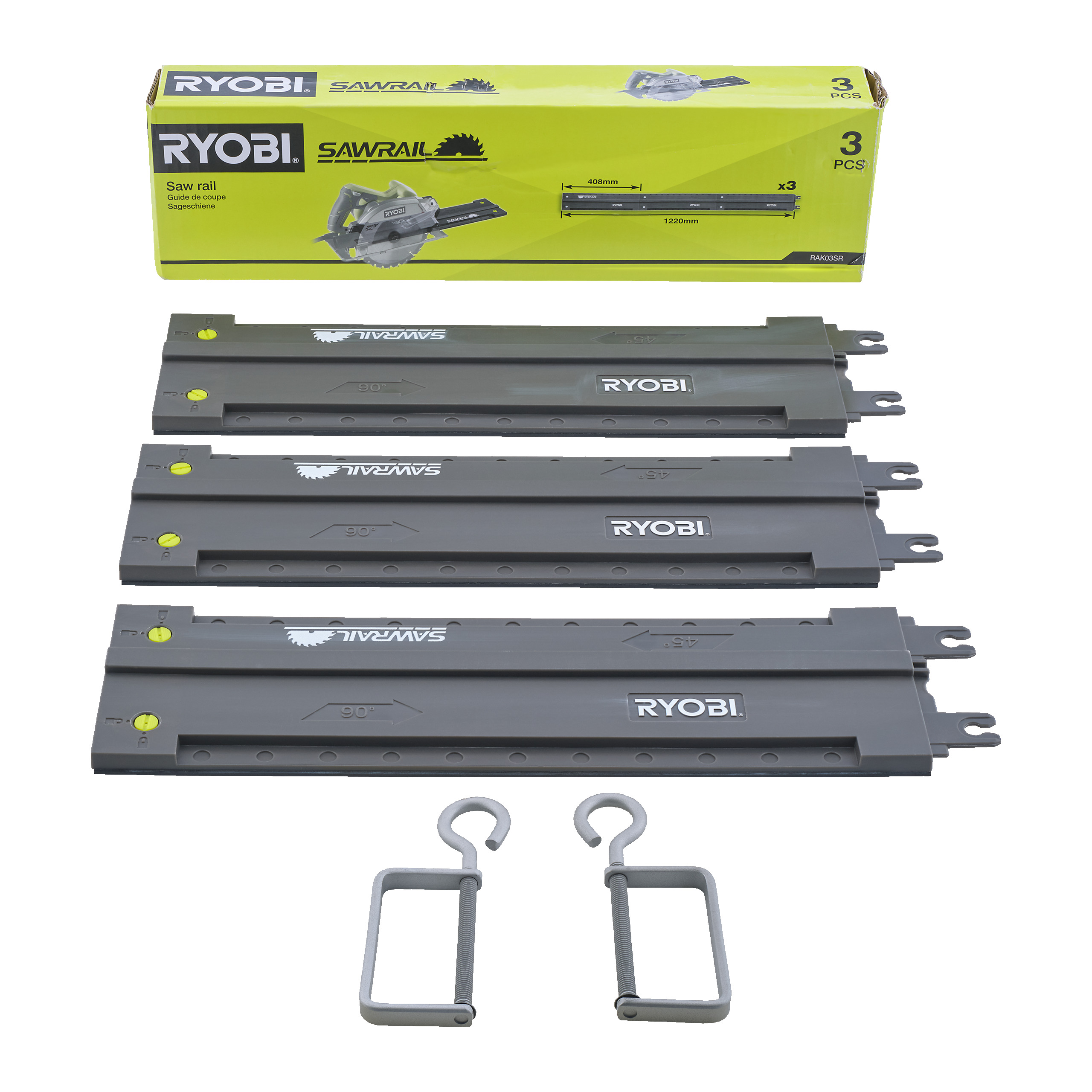 - Șine pentru fierăstrău ușor de asamblat cu un sistem de blocare ușoară. Benzi din cauciuc pentru aderarea la suprafața materialului și x2 cleme pentru securizare sporită.