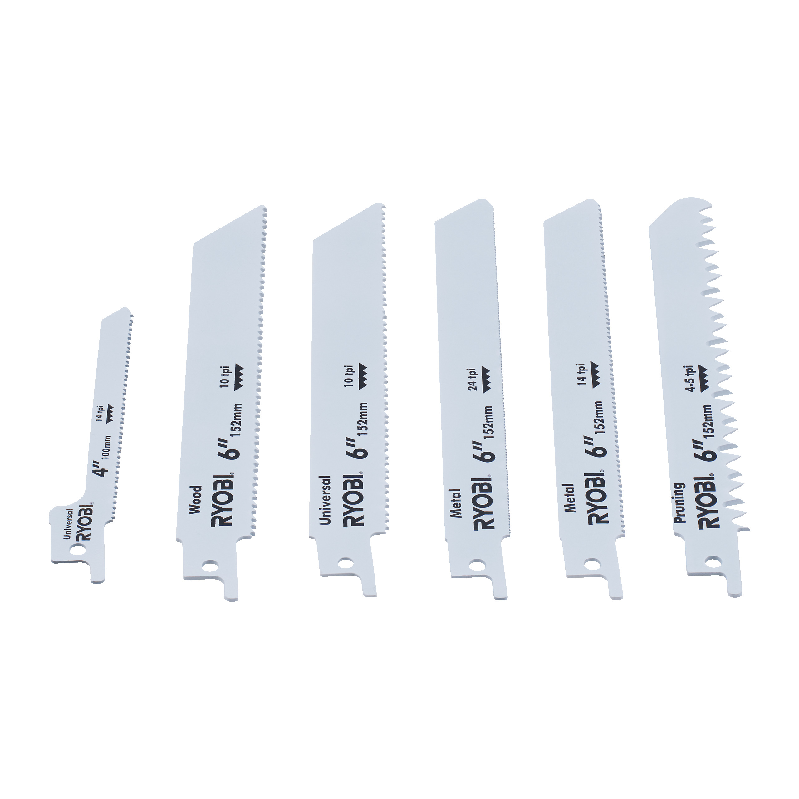 - Set pânze ferăstrău sabie 6 buc (1 x Pânză universală subțire (14TPI), 1 x Pânză tăiere lemn (10TPI), 1 x Pânză tăiere metal (24TPI), 1 x Pânză tăiere metal (14TPI), 1 x Pânză tăiere crengi (4-5TPI), 1 x Pânză universală (10TPI) )